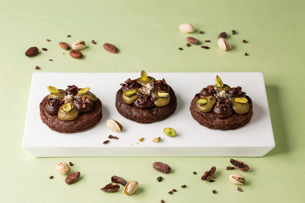 ベルギー本国のメニューを再現。自家製ピスタチオのプラリネと、ガナッシュをトッピング。店舗で焼きあげ出来立てを提供いたします。当日販売は数に限りがございますが、この機会にぜひ手に取っていただければ幸いです。(※銀座三越WEB先行予約販売分は完売いたしました)